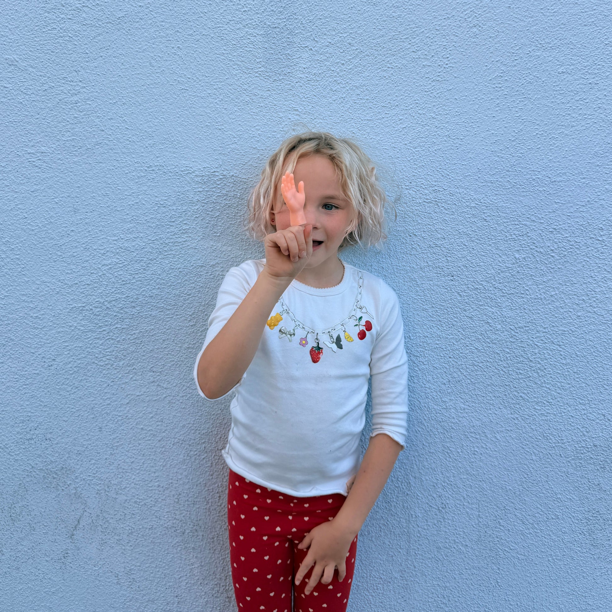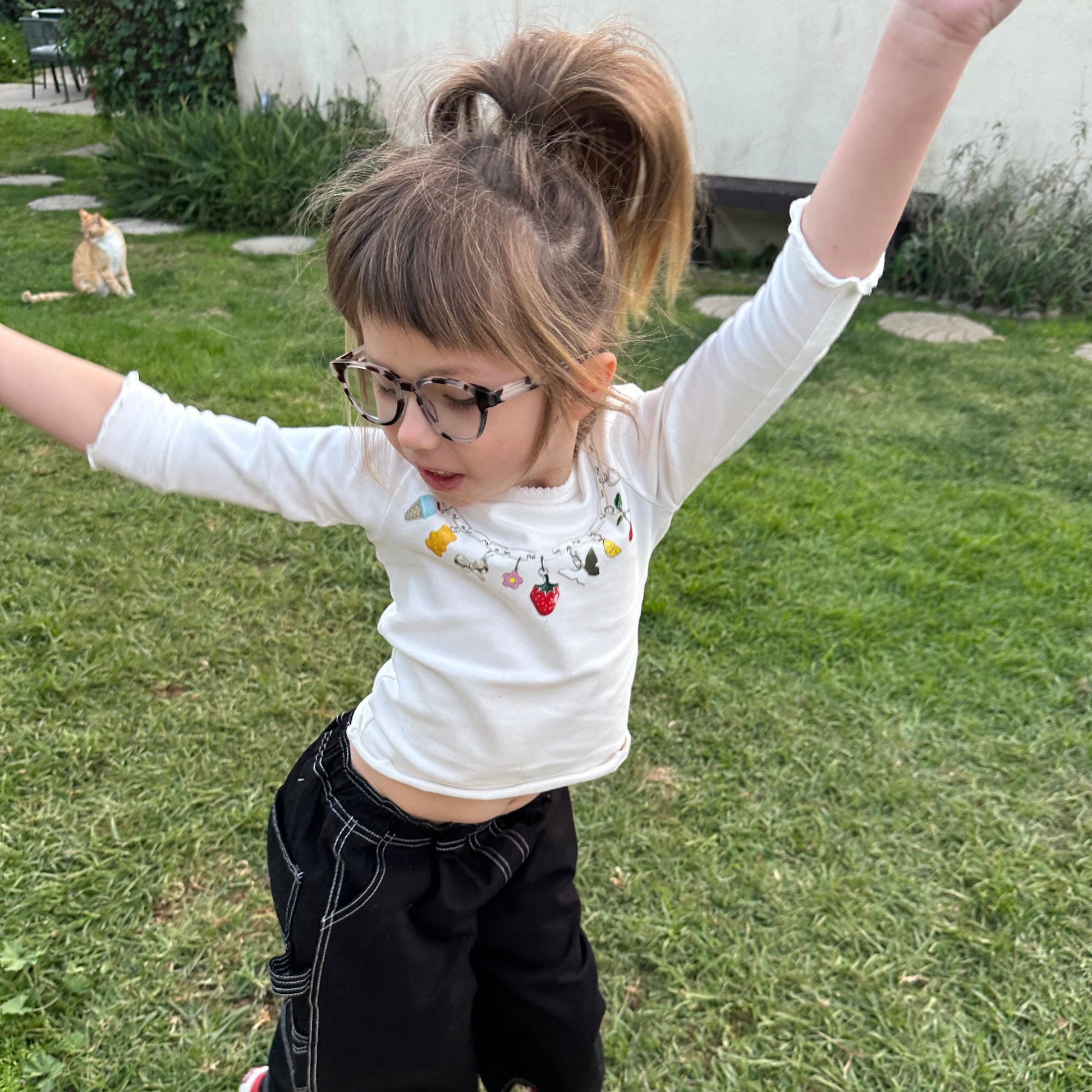 This long sleeve white tee features a charming graphic print of a delicate charm necklace right at the neckline, adding a playful touch of jewelry without the fuss. Soft, stretchy, and perfect for layering or wearing on its own.