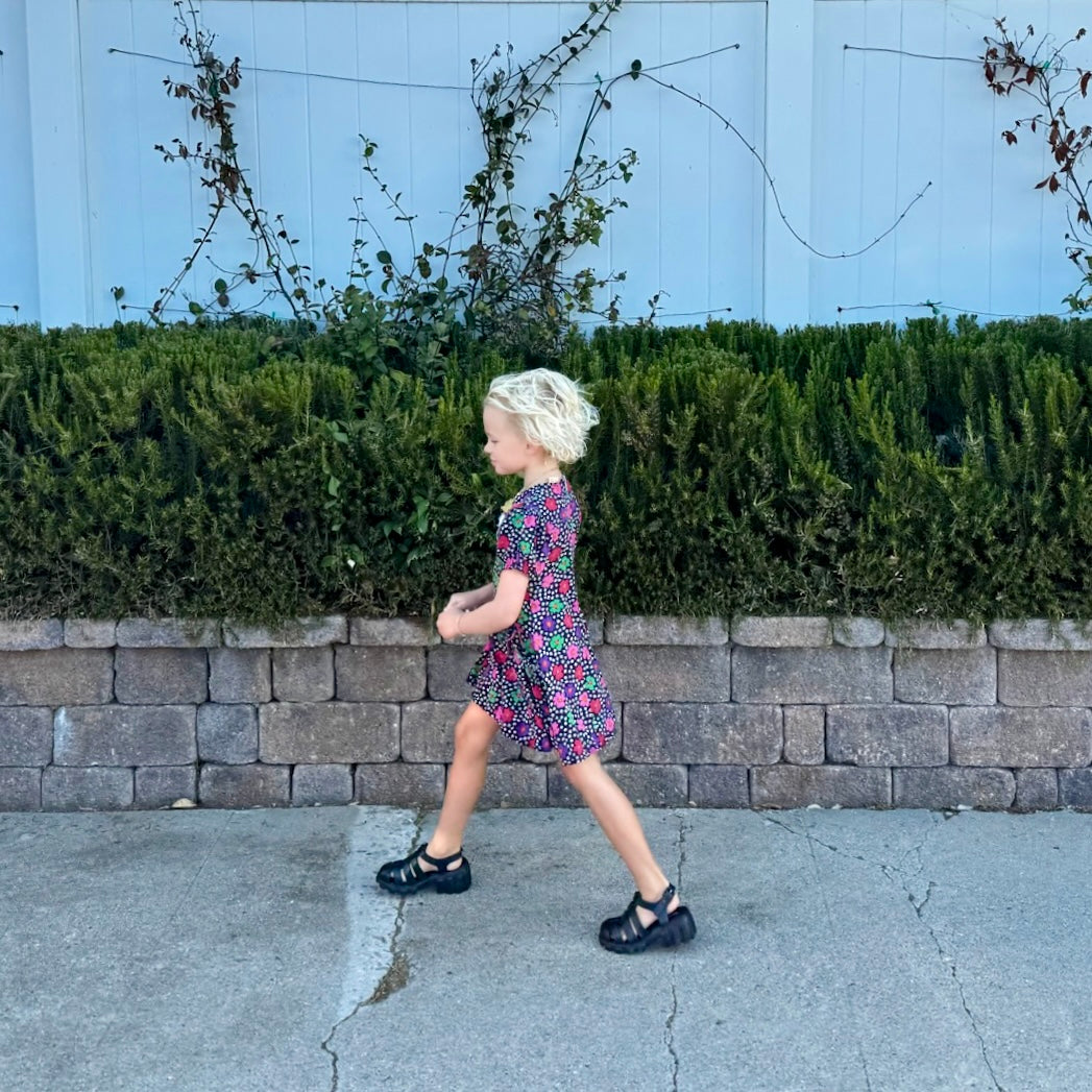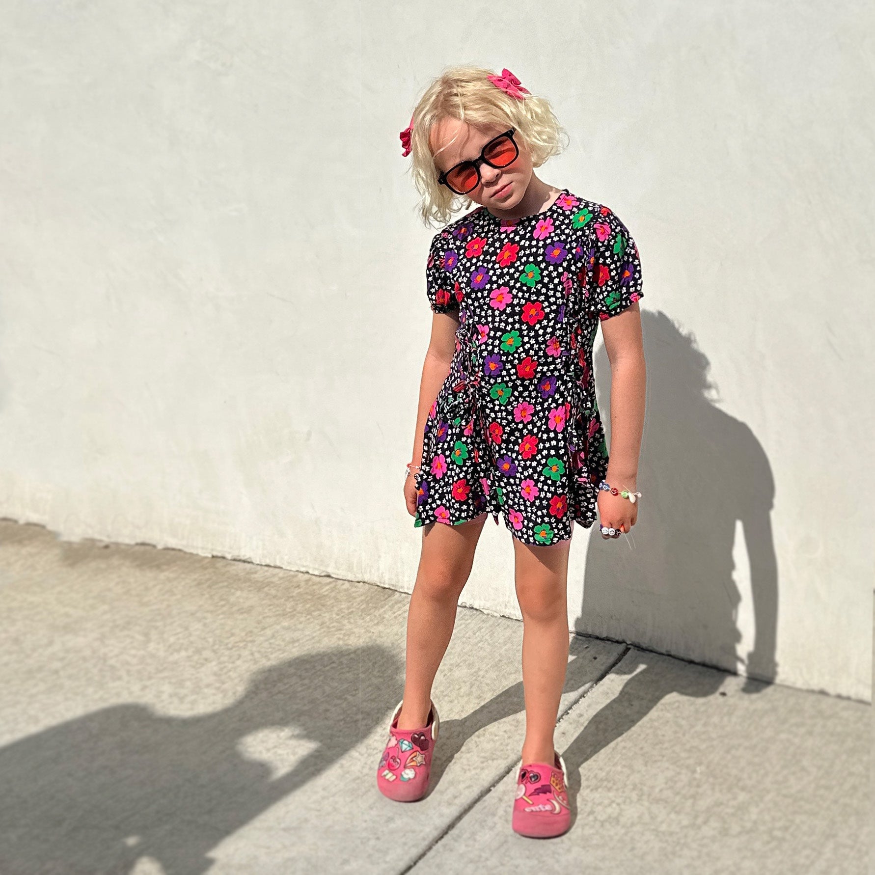 We love this dress with ruffle socks, charmed-out sneakers and a a few dozen butterfly clips.