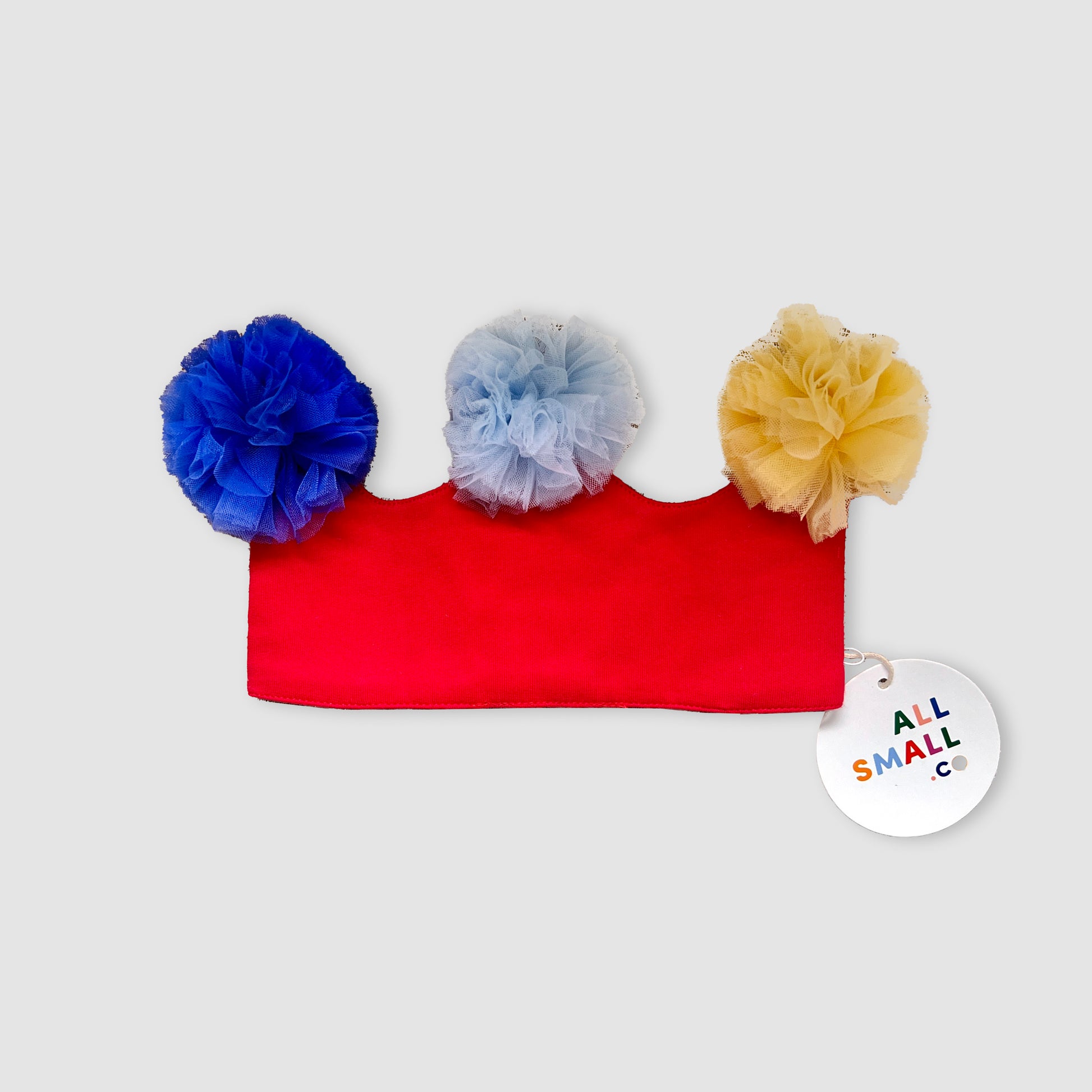 We all know small's running the show, so we may as well adorn them in the royal garb to match. This pompom crown is made from a soft cotton with elasticized back band. All-gender.
