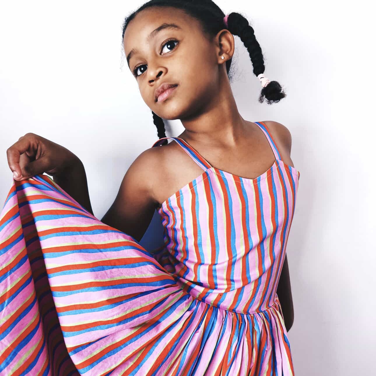 Made rainbow striped 100% cotton, with cotton lining under layers of fluffy tulle. Button holes on the shoulder strap for 3 strap length adjustment.