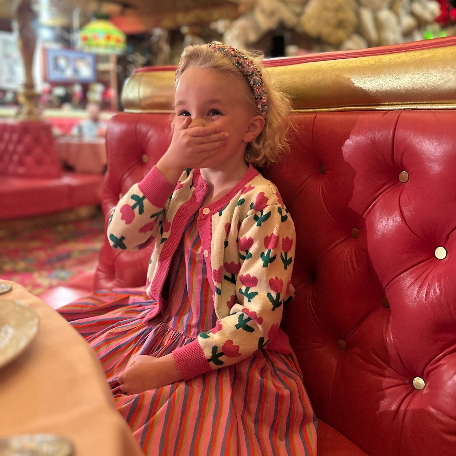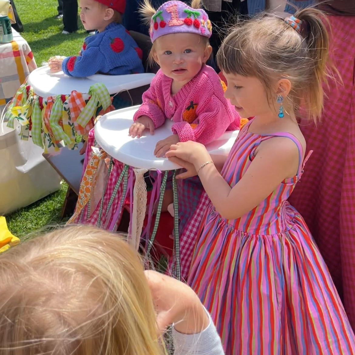 We love this ball gown style look with colorful sneakers, mismatched socks and our Tangerine Cardigan.