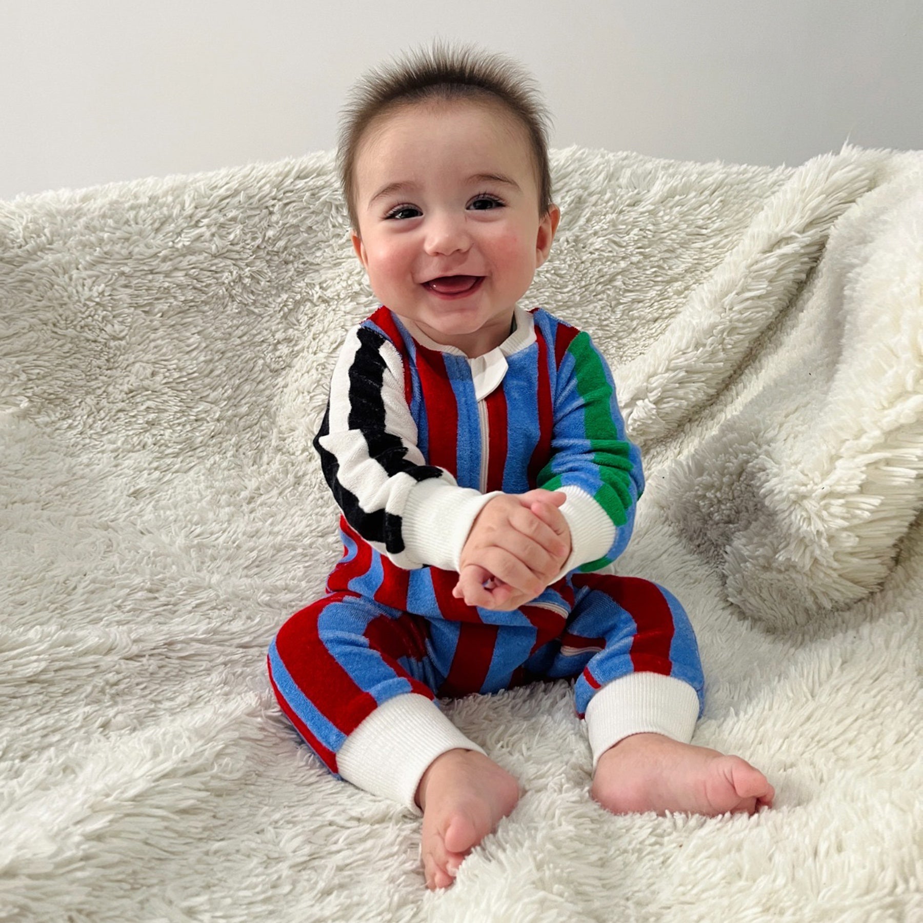 100% cotton terry fabric – soft, breathable, and gentle on baby's skin. Bold striped pattern in our signature playful style. Full-length zipper for easy on and off. Long sleeves for extra warmth and coverage. Soft and stretchy for freedom of movement. All-gender design. Available in sizes Newborn, 6 Months, and 12 Months.
